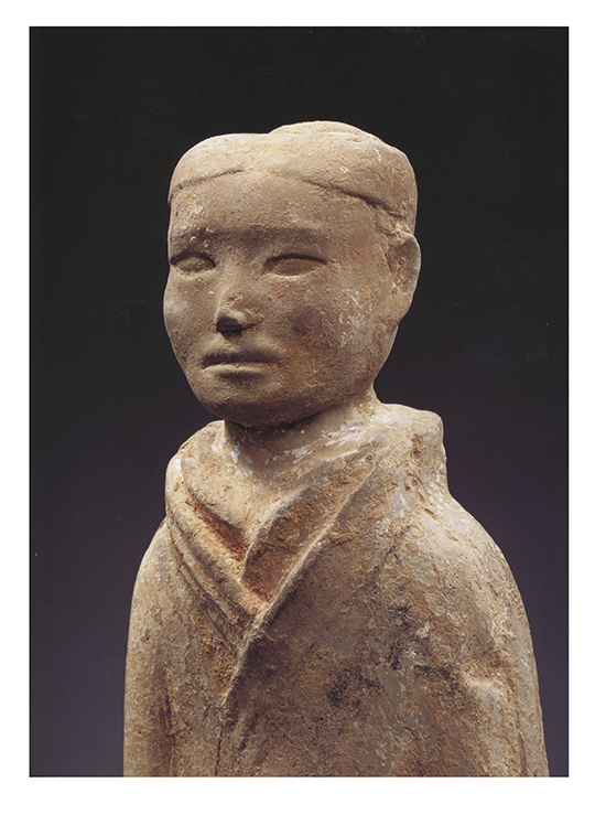 此俑頭戴平頂幘,身著三重深衣,外罩博袖長(zhǎng)袍,高領(lǐng)右衽,腰際束帶。雙手拱于胸前,寬袖遮蓋雙手,上有一長(zhǎng)方形孔,原應(yīng)持有令笏之類。左肋下亦有一長(zhǎng)方形孔,可能原來(lái)插有木質(zhì)長(zhǎng)劍之類的兵器。袖部和領(lǐng)部殘存有紅彩。陶俑身材魁偉高大,其身份應(yīng)當(dāng)是官吏俑。