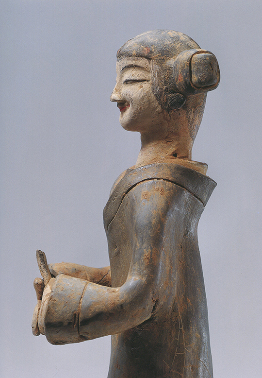 女俑雙髻盤于兩耳側(cè),發(fā)式別致。面部有紅、黑兩色靨,細(xì)眉上挑,高鼻直挺,朱唇含笑。上身著黑色短衣,下著肥管長(zhǎng)褲,露履于外,雙手相合擁笏于胸前。這種短衣長(zhǎng)褲的服飾來(lái)源于中國(guó)北方的游牧民族。此俑為典型的北方胡人少女形象,天真爛漫,生動(dòng)自然。