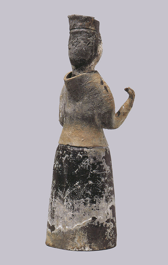 泥質(zhì)灰陶,通體施黑彩。俑頭帶小冠,臉形瘦長,細眉長眼,朱唇高鼻,略帶微笑。身穿長袍,窄袖,袍下身較寬大,著圓領(lǐng)內(nèi)衣,足穿圓口平底鞋。右臂半屈于胸前,左手垂于腰間,雙手半握作執(zhí)物狀。面目清秀、溫順,姿態(tài)恬靜、優(yōu)美。