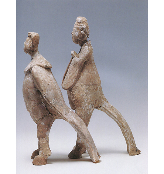 此類俑有雌雄兩種。雌性為“千秋”,面部圓潤,體態(tài)豐滿,背生雙翅,足為奇蹄;著博袖衣,雙手拱于胸前,為偶蹄。東晉葛洪《抱樸子.對俗》曰:“千歲之鳥,萬歲之禽,皆人面而鳥身,壽亦如其名。”